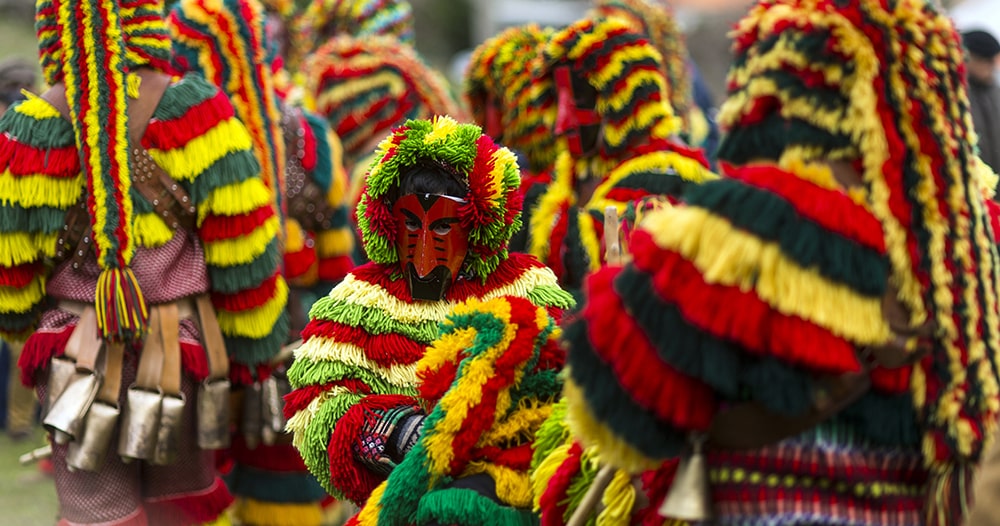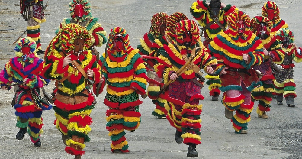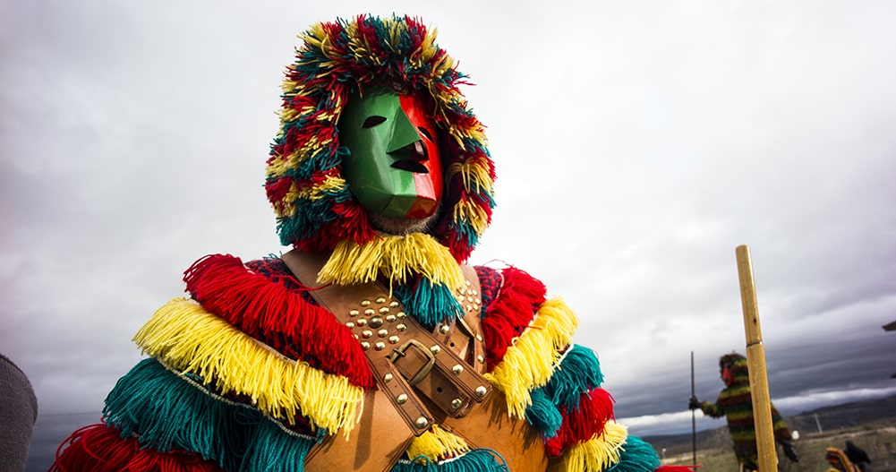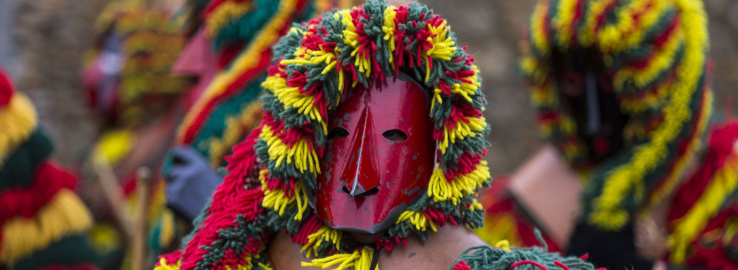During Carnival, the devilish figures of the Caretos roam the streets of Podence, making lots of noise to disturb the usual peace and quiet of the village. These “troublemakers” are boys in costumes with colorful fringe and masks made of tin or leather with pointed noses; rattles are attached around the waist.