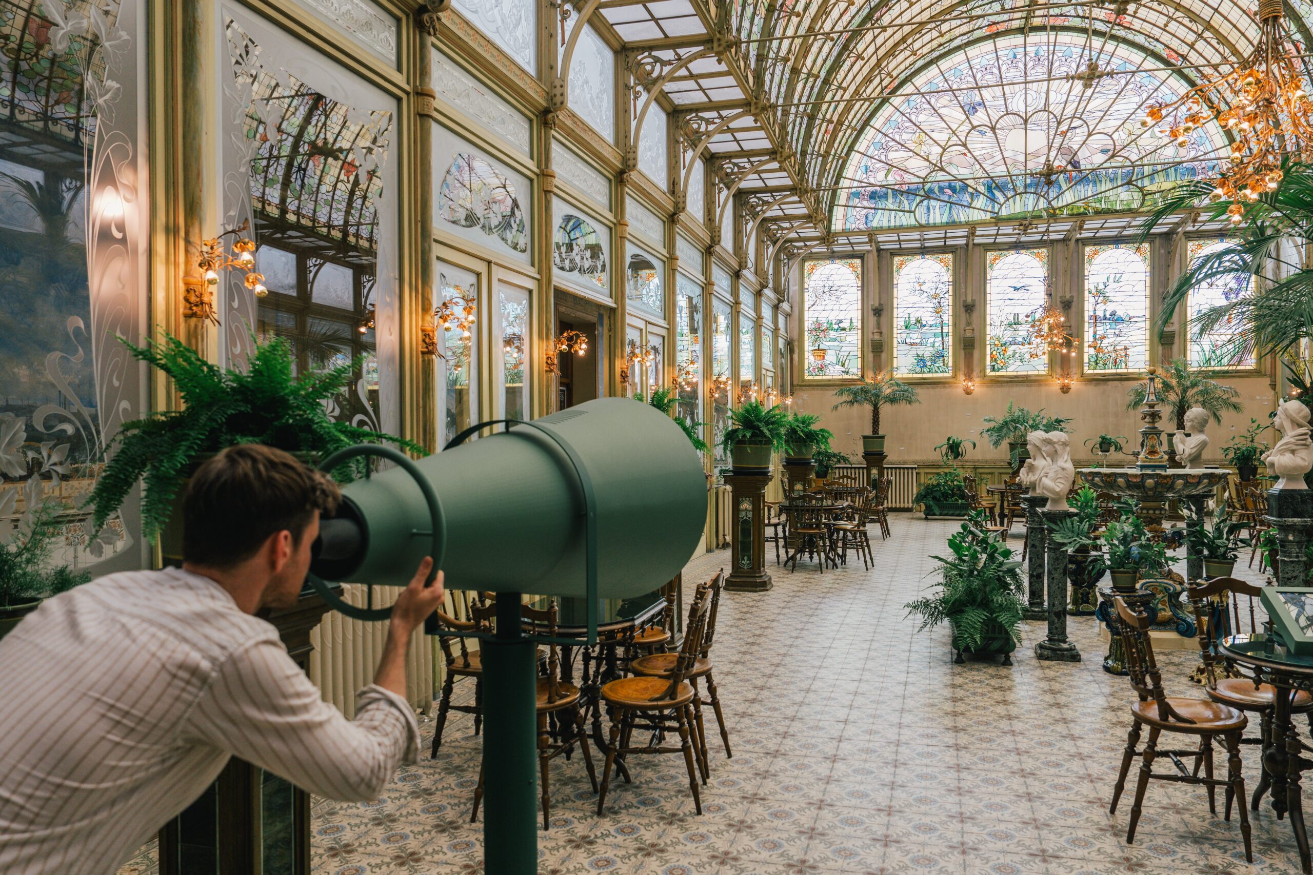 In the Winter Garden of the Ursulines, it’s always spring. The tiniest ray of sunlight creates an extraordinary effect through the colorful stained-glass windows. It’s a stunning example of Art Nouveau, and what’s more, it’s completely accessible to everyone.