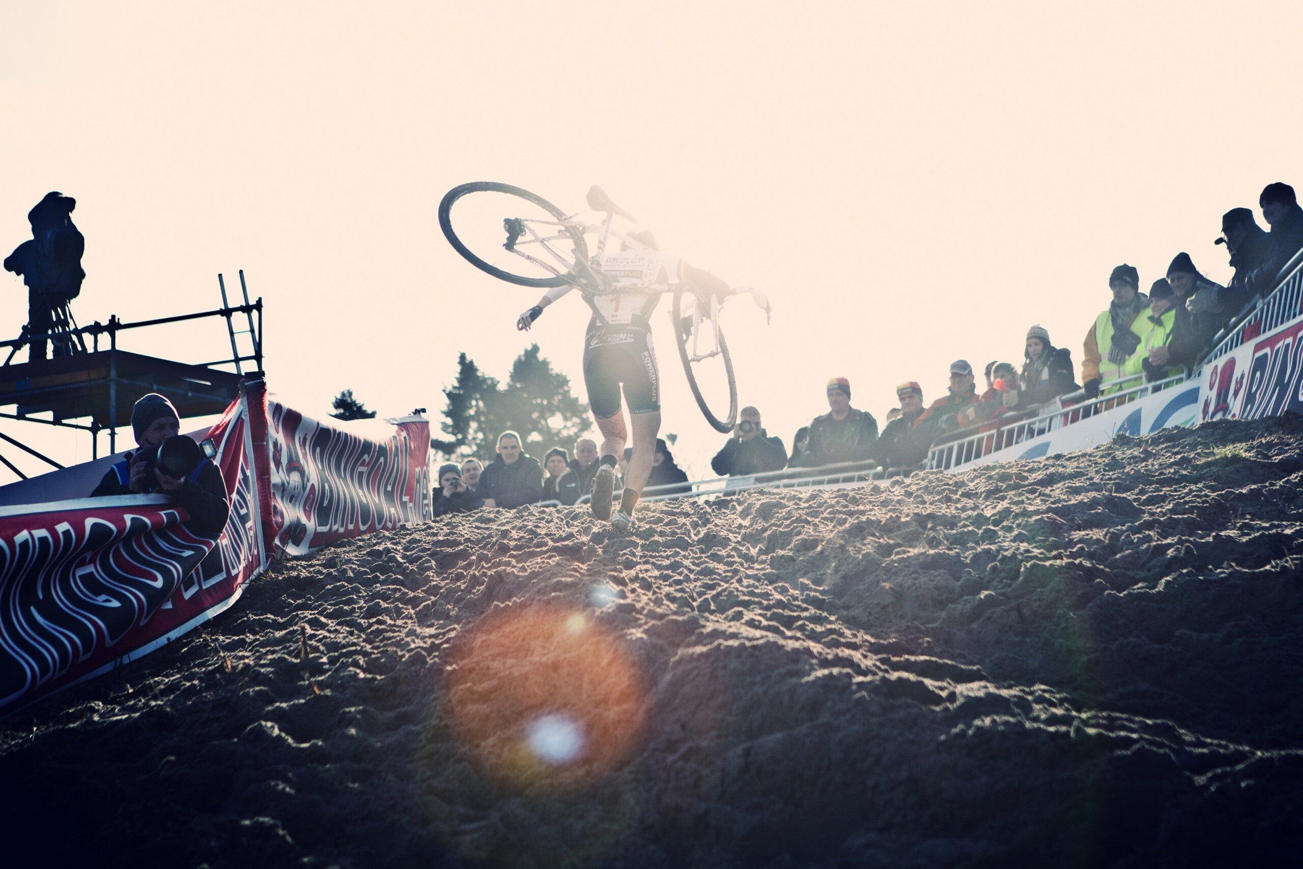In autumn and winter, Flandriens compete on other fronts. This is when riders force their way through the loose sand. They trudge through the mud. They fight their way through the mire, bicycle on shoulder. Downhill, uphill, maneuvering through the trees and obstacles. And they keep on doing so until the end of the race. Unlike road races, cyclo-cross takes place on a closed circuit. The riders complete the same lap over and over again, until the strongest rider has won, and the rest humbly bow their heads.