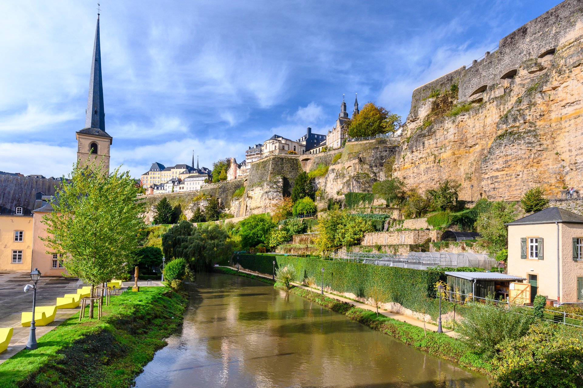 If you only have an hour or two, the best way to soak up the atmosphere is by strolling through the Petrusse and Grund valleys to the lush grounds of Neumunster Abbey. Look up at the Bock cliffs and the Corniche balcony, then follow the river to the City Youth Hostel, where ramparts continue up the slope to the Kirchberg plateau and Dräi Eechelen museum.