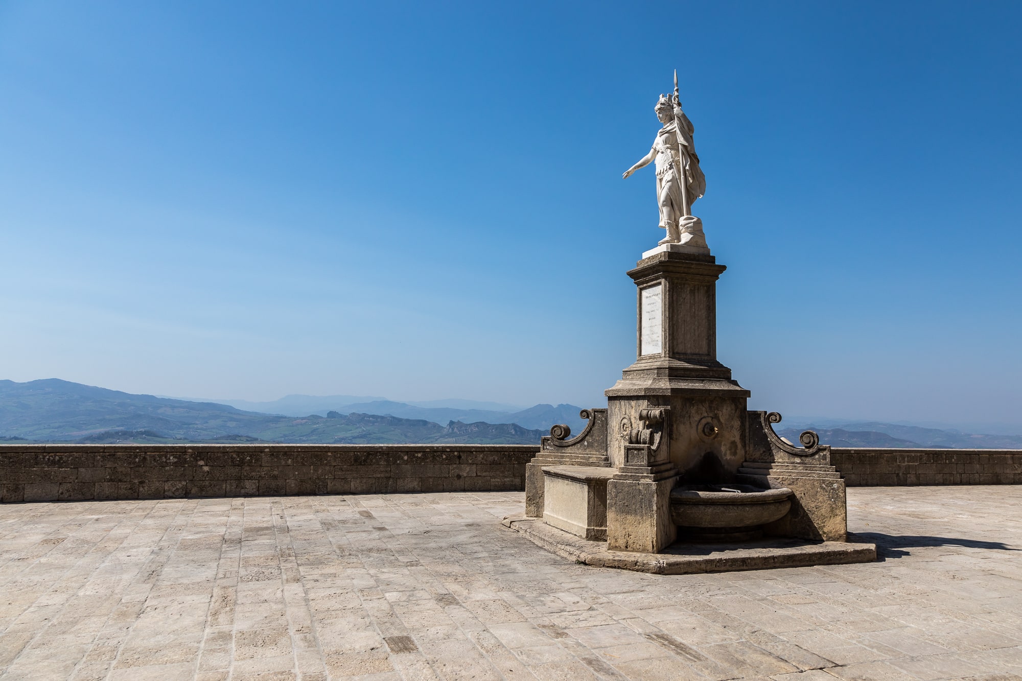 Continue climbing until you reach Piazza della Libertà, surrounded by the Public Palace and the Parva Domus Comunis. Focus on the fountain with the Statue of Liberty in the center of the square. The elegant statue was donated by Countess Otilia Heyroth Wagener. The Republic bestowed on her the title of Duchess of Acquaviva as a token of gratitude.