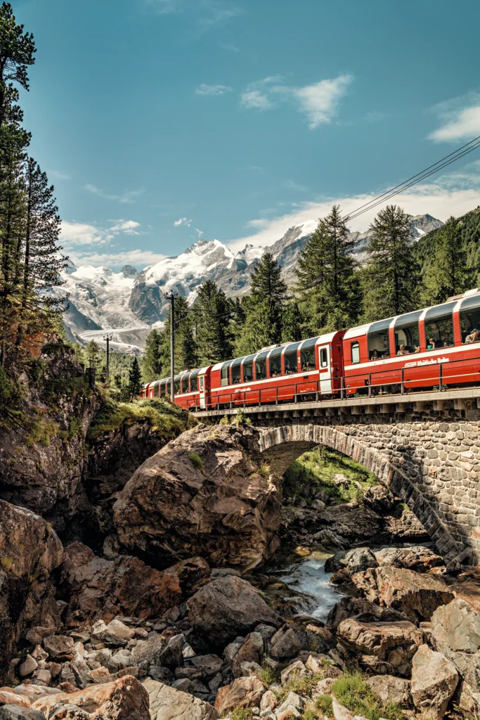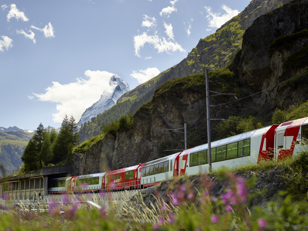 The Glacier Express remains one of the most iconic Swiss rail experiences. Running between Zermatt and St. Moritz, it travels across the Swiss Alps, crossing hundreds of bridges and passing through numerous tunnels. From its panoramic windows, passengers can follow deep valleys, mountain villages, and high alpine landscapes, including the famous Landwasser Viaduct and the dramatic Rhine Gorge along the way.