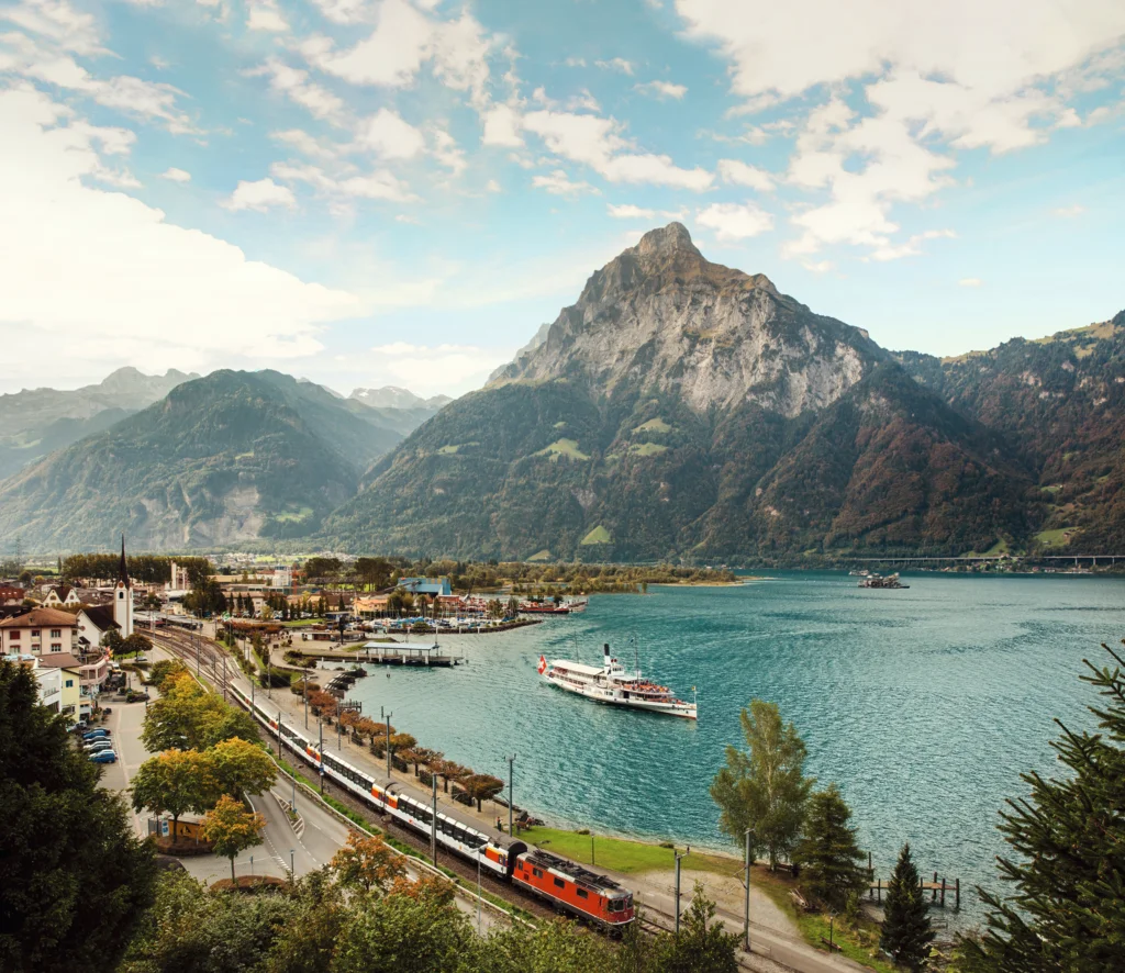 Some unique routes pair rail with water for a truly scenic adventure. Along the Gotthard Panorama Express, travelers begin aboard a historic paddle steamer on Lake Lucerne before boarding a train through the original Gotthard tunnels. Steep slopes, quaint villages, and dramatic mountain scenery unfold at every turn, offering a glimpse into Switzerland’s historic alpine crossings.