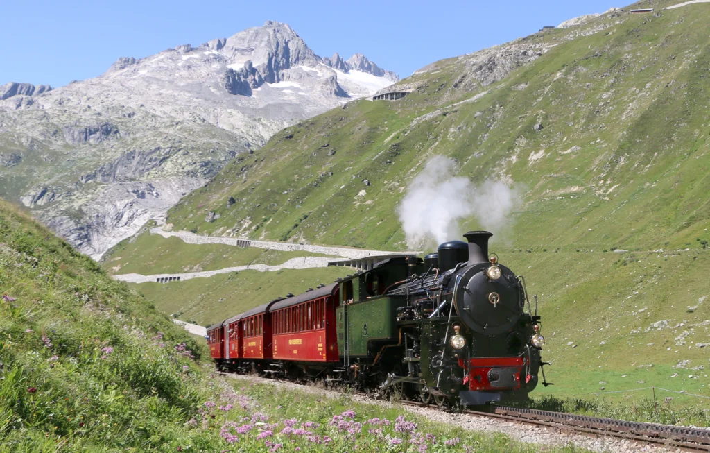 Finishing the journey through Switzerland’s most iconic railways, the Furka cogwheel railway climbs from Realp to Oberwald. Steam engines make their way up steep alpine slopes, passing historic tunnels and open meadows. Along the route, travelers can enjoy views of the Rhone Glacier and surrounding peaks, creating a scenic and memorable journey.
